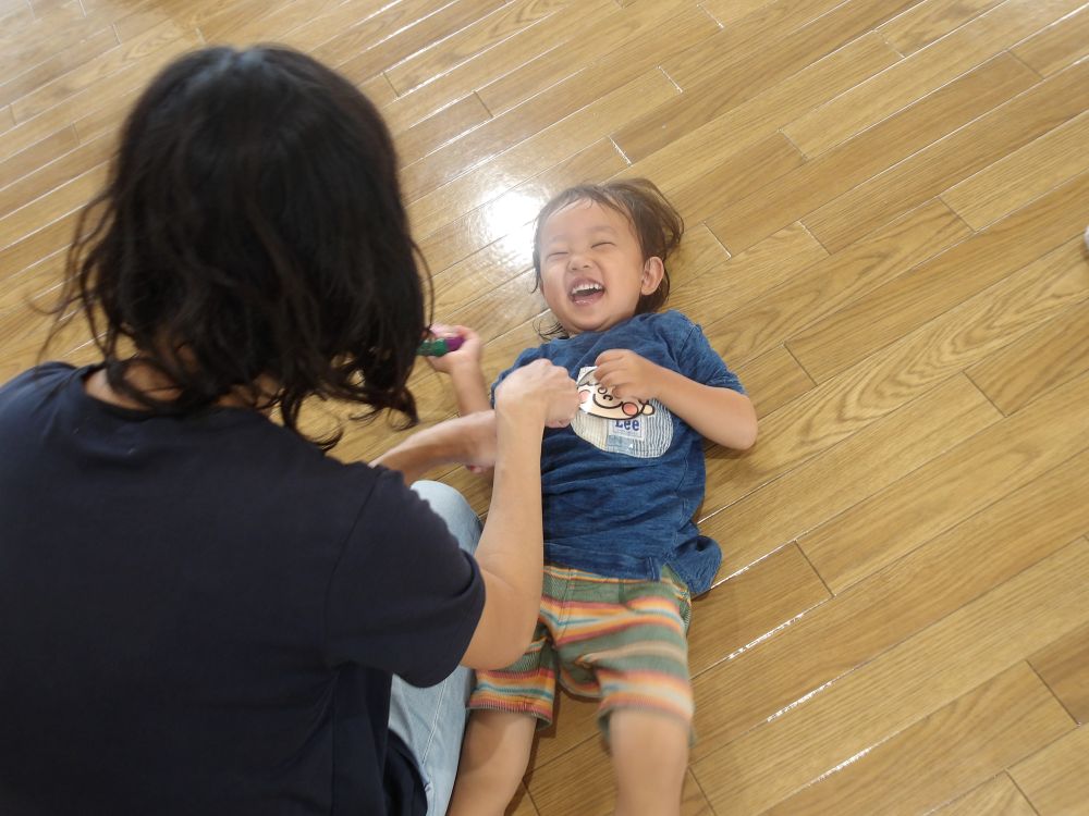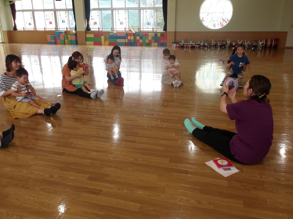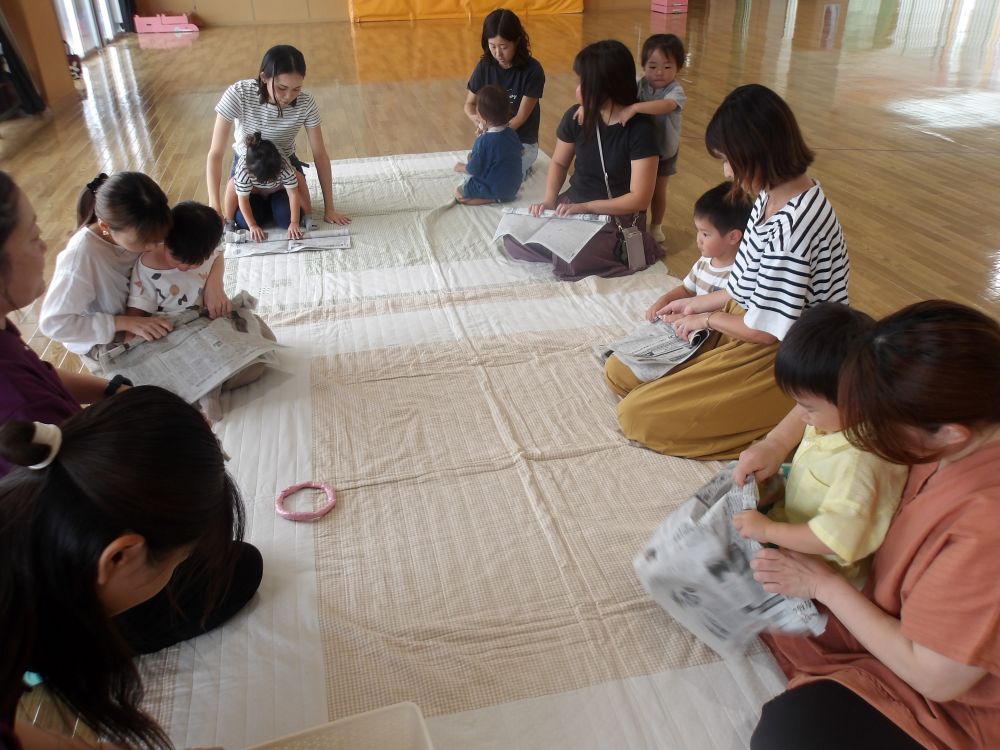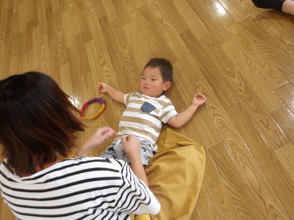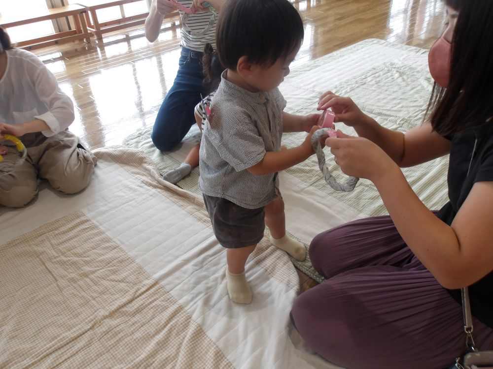 | 今日の親子くらぶは「ふれあい遊び♪」。 始めに新聞紙をくるくる巻いて好きな色のテープを巻いて自分だけのハンドル作り!!完成したハンドルを使ってバスごっこ♪ お母さんに抱っこしてもらったり、頬やおでこをくっつけたりしてふれあい遊びを楽しみました☺ |