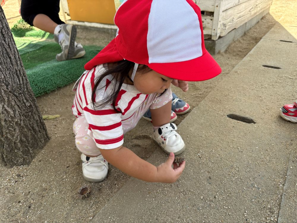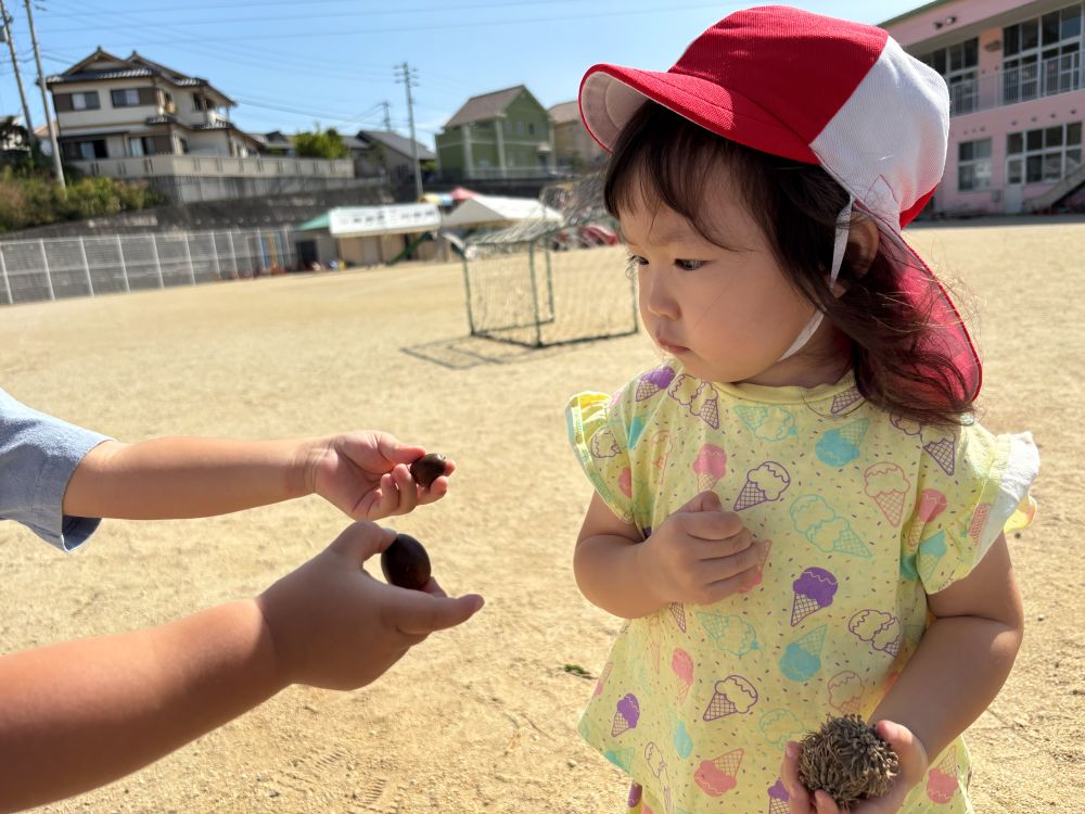 | 園庭に出るとすぐに、どんぐりの木まで一直線に走り、落ちてるどんぐりをいっぱい手にして満足そうな子。 「ちょうだい!」という子に分けてあげたりもしていました。 「どんぐりの木はどれ?」という先生の質問に、指差しをしてくれる子もいました。 秋を感じながら、友達と仲良く遊びました。 |