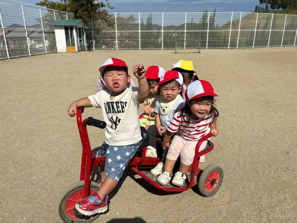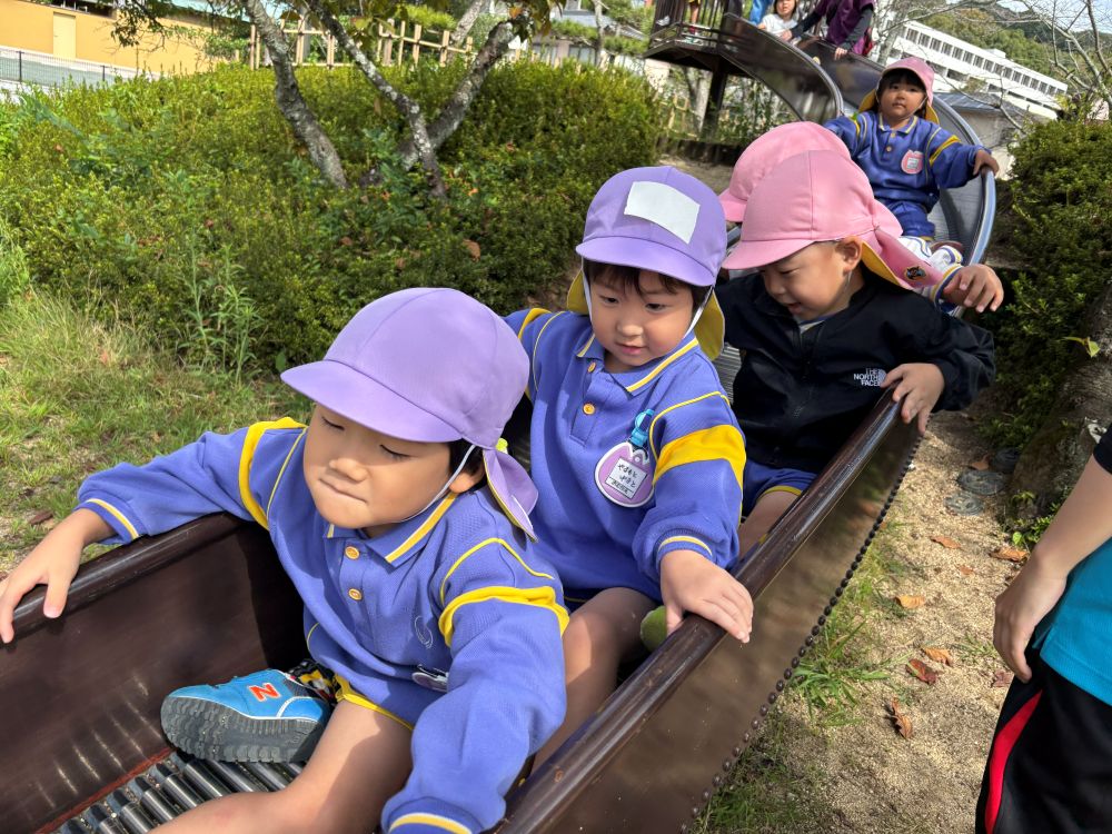 | 今日は、今までになく過ごしやすい天気で、心地よい風も吹いたりして、心地よい遠足日和りでした。 どんぐりやいろんな形や色の葉っぱを拾って、大はしゃぎ♪ その後は、公園で元気いっぱい遊んで大はしゃぎ♪ 遊んだ後には、手作り弁当を開けて大喜び♪ 帰りのバスでは、眠くなっちゃいました(˘ω˘)💤 |