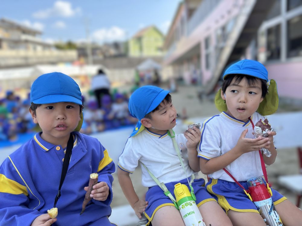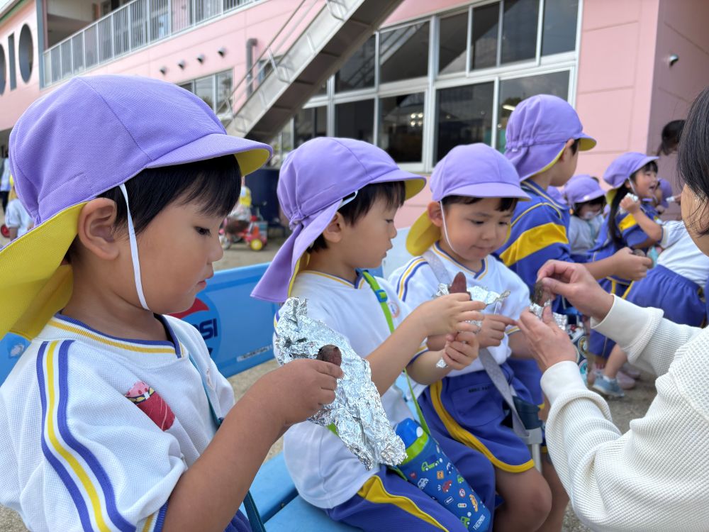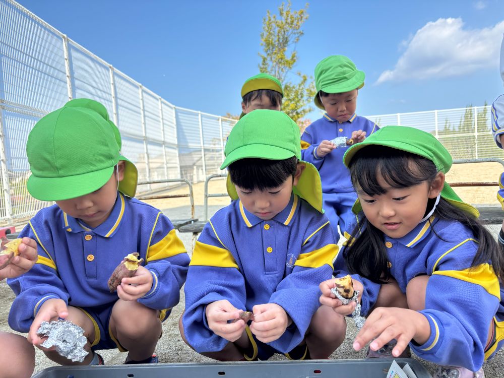 | 今日は、みんなで掘ったさつまいもで、焼き芋パーティー\(^o^)/年長さんが朝からお芋をきれいに洗ってくれて、アルミホイルでしっかりと包んでくれました。炭火で焼きあがるにつれ、園庭に広がる甘〜い いい匂い🍠子どもたちは、食べる順番を楽しみに待っていました。順番が来ると、まだあったかいお芋を手にして、アルミホイルを自分ではがし、口に頬張ると、「おいしい!おいしい!」と言いながら、食べていました。 |