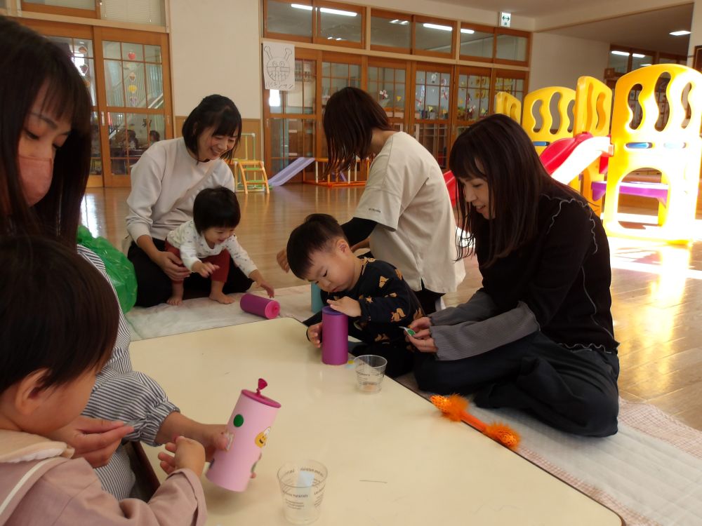 | 今日の親子くらぶは「ふれあい遊び♪」。 始めに新聞紙をくるくる巻いて好きな色のテープを巻いて自分だけのハンドル作り!!完成したハンドルを使ってバスごっこ♪ お母さんに抱っこしてもらったり、頬やおでこをくっつけたりしてふれあい遊びを楽しみました☺ |