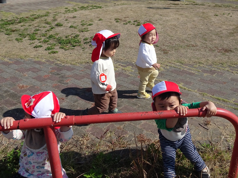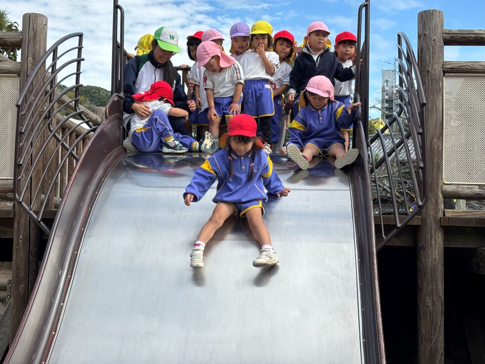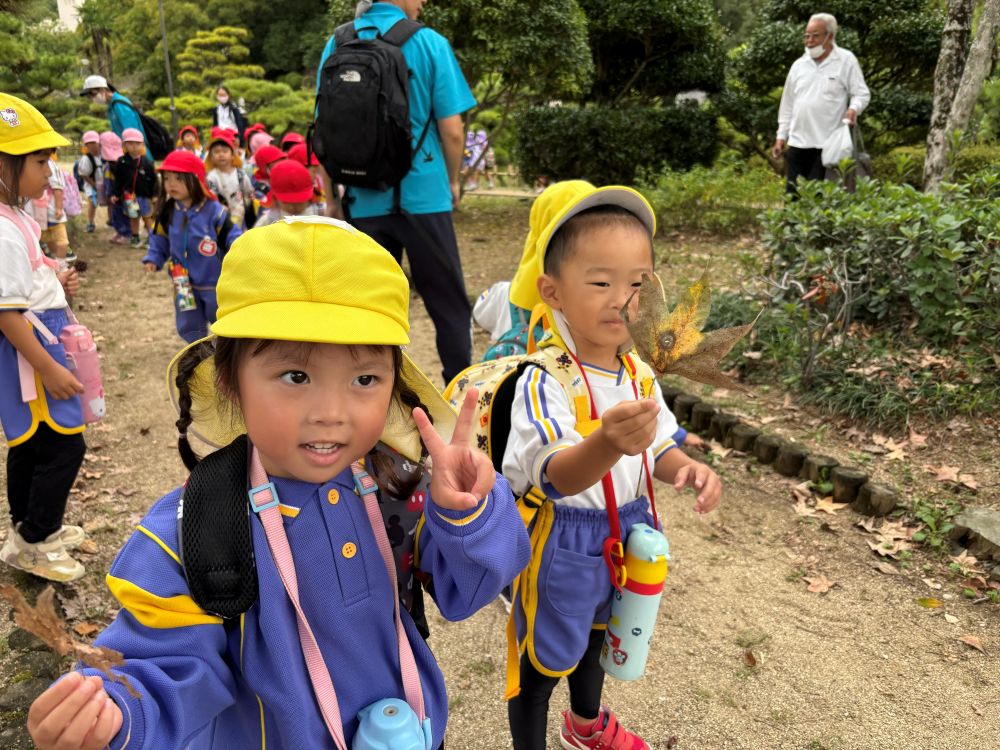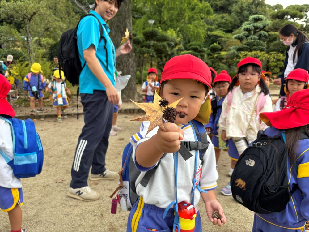 | 今日は、今までになく過ごしやすい天気で、心地よい風も吹いたりして、心地よい遠足日和りでした。 どんぐりやいろんな形や色の葉っぱを拾って、大はしゃぎ♪ その後は、公園で元気いっぱい遊んで大はしゃぎ♪ 遊んだ後には、手作り弁当を開けて大喜び♪ 帰りのバスでは、眠くなっちゃいました(˘ω˘)💤 |