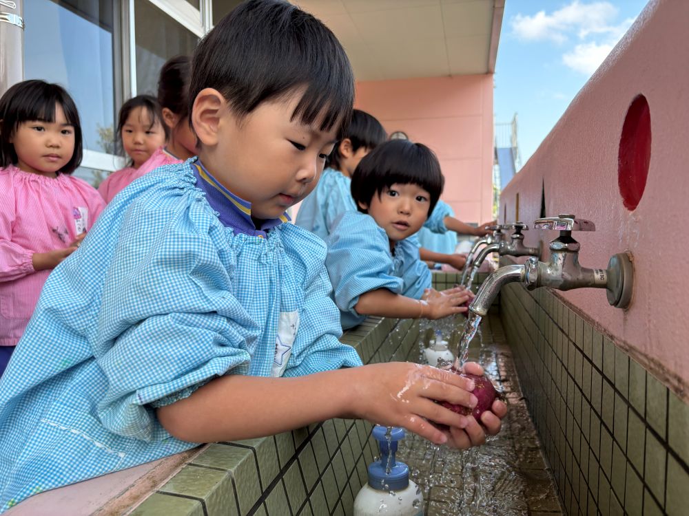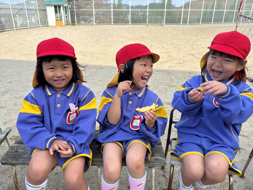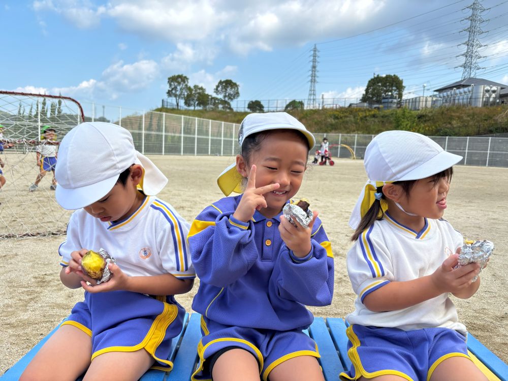 | 今日は、みんなで掘ったさつまいもで、焼き芋パーティー\(^o^)/年長さんが朝からお芋をきれいに洗ってくれて、アルミホイルでしっかりと包んでくれました。炭火で焼きあがるにつれ、園庭に広がる甘〜い いい匂い🍠子どもたちは、食べる順番を楽しみに待っていました。順番が来ると、まだあったかいお芋を手にして、アルミホイルを自分ではがし、口に頬張ると、「おいしい!おいしい!」と言いながら、食べていました。 |