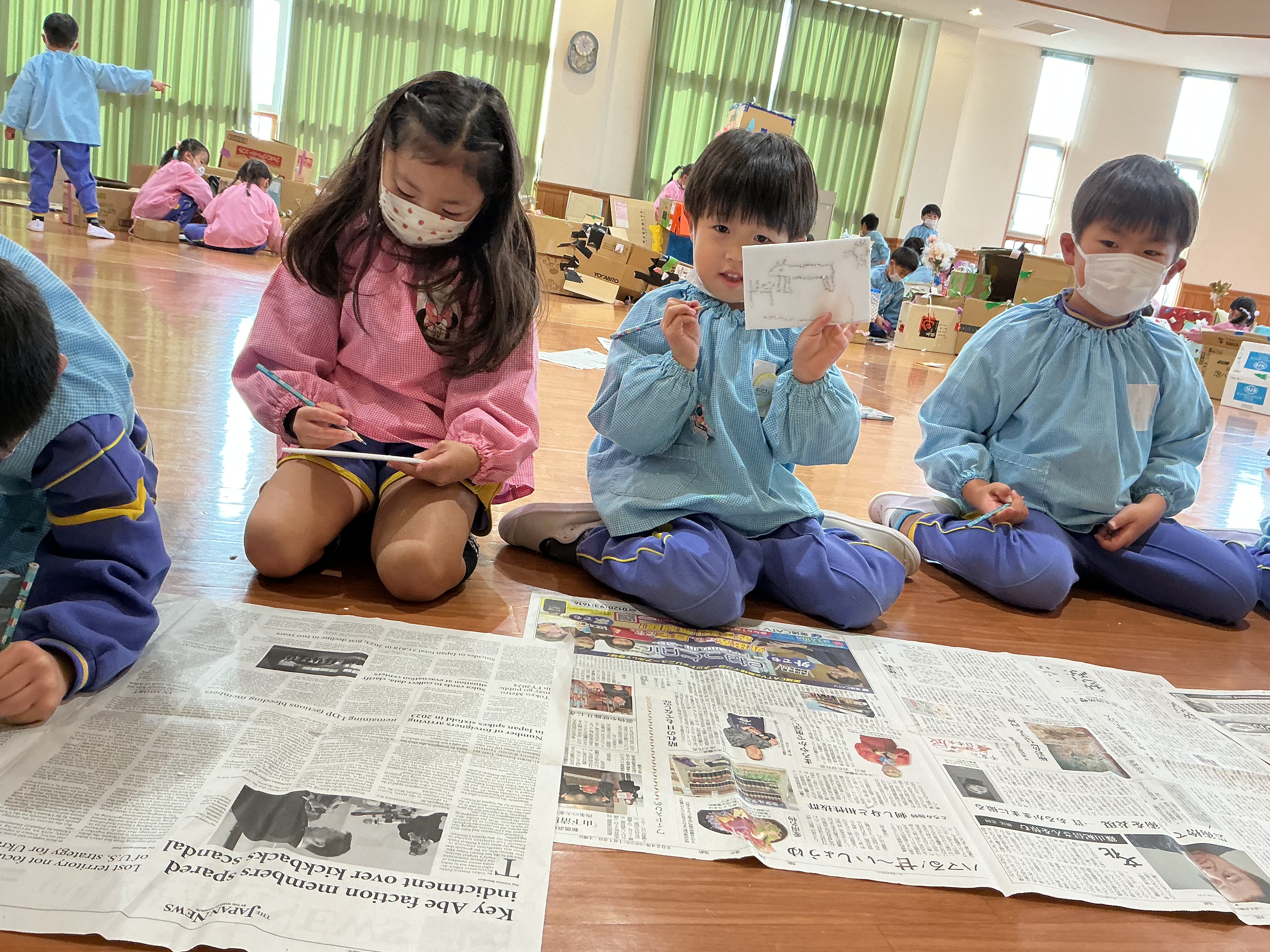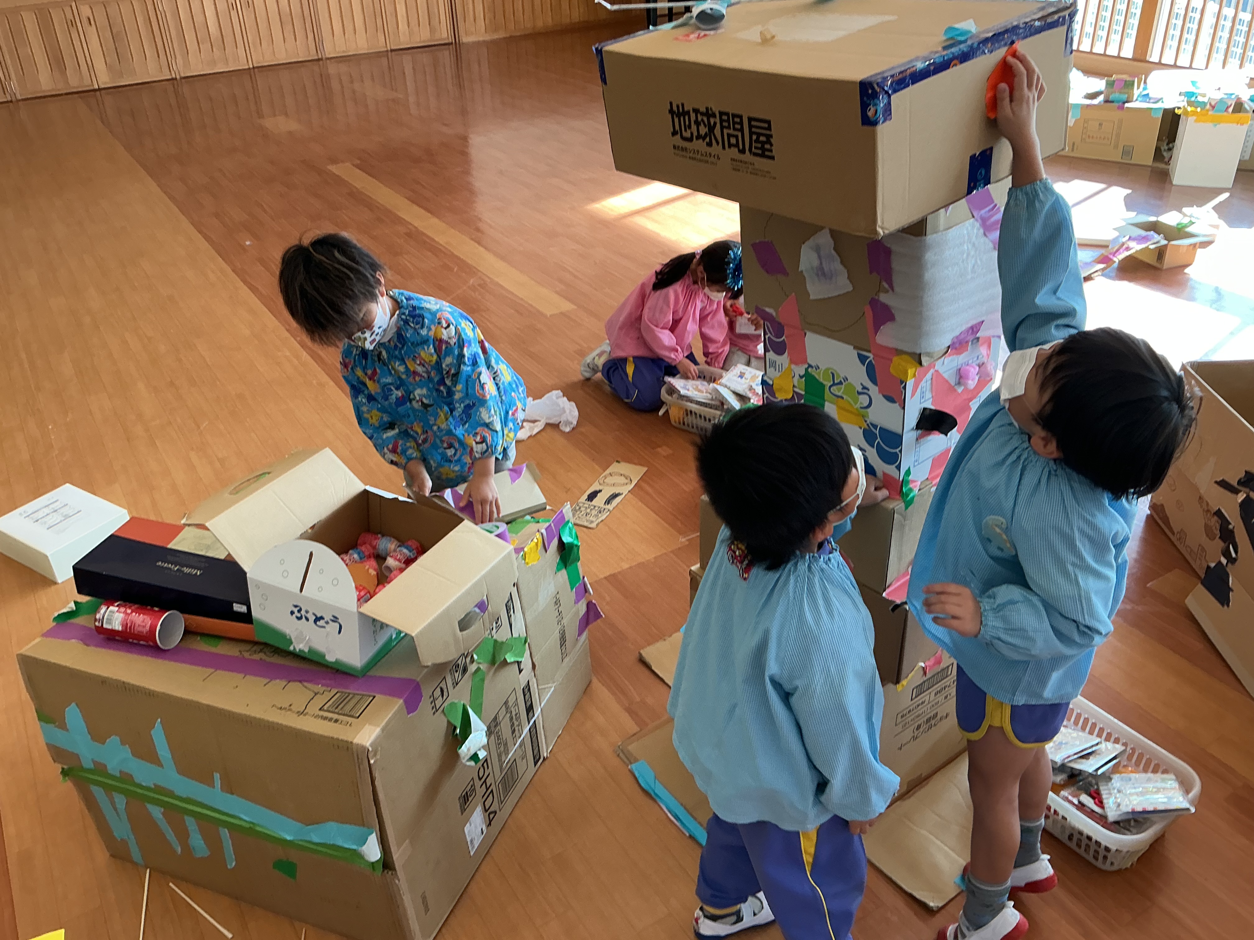 年長組さんは、今日も活動が、盛りだくさん!!商店街をみんなで改装したり、版画の原版を作ったり、サッカーをしたりと楽しく過ごしました。毎日、いろんな経験をしています。