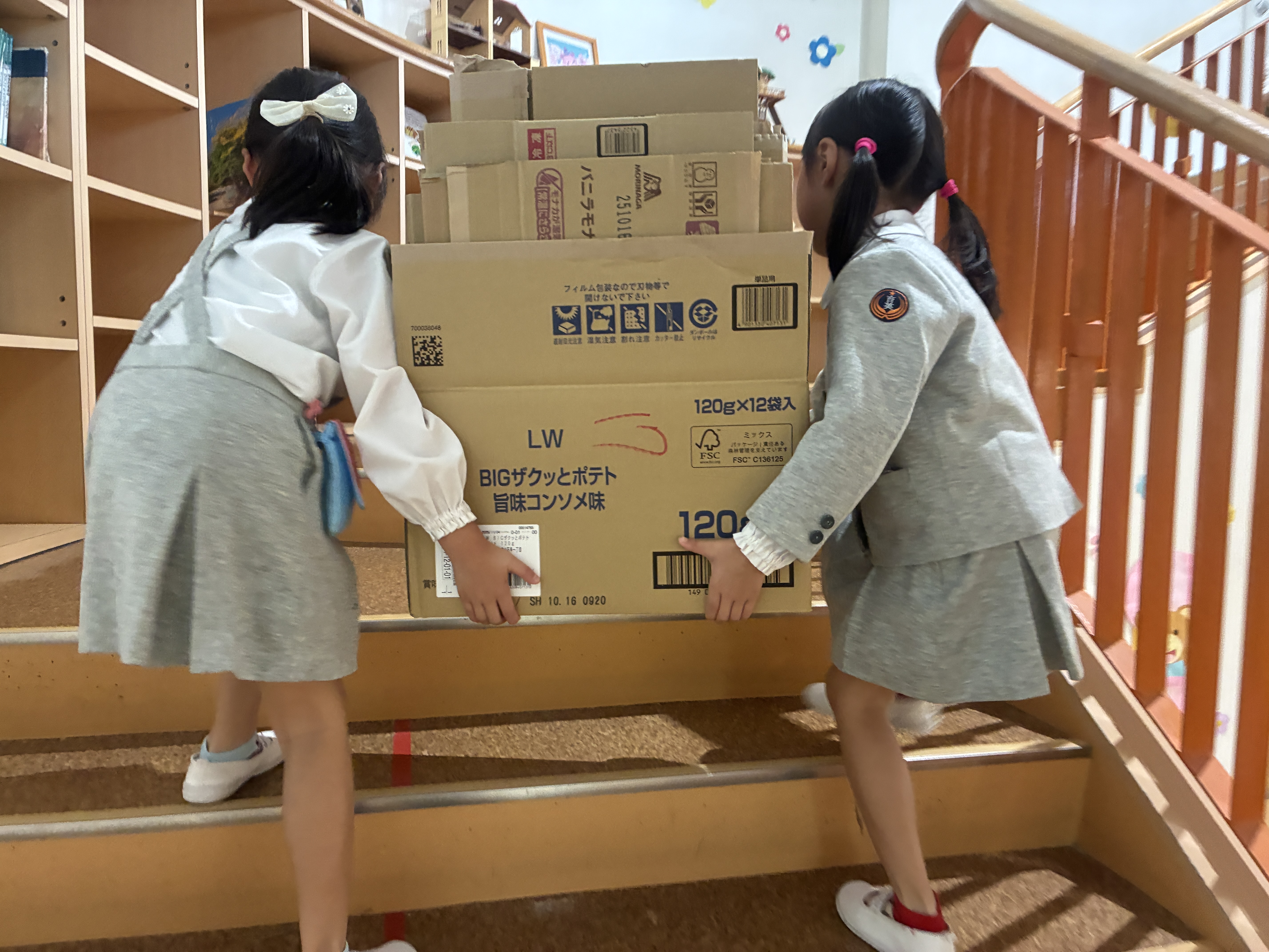 もうすぐ作品展。子供たちは、自分たちで材料を集めています。持ってきたら、力を合わせて、運んでいく姿も
